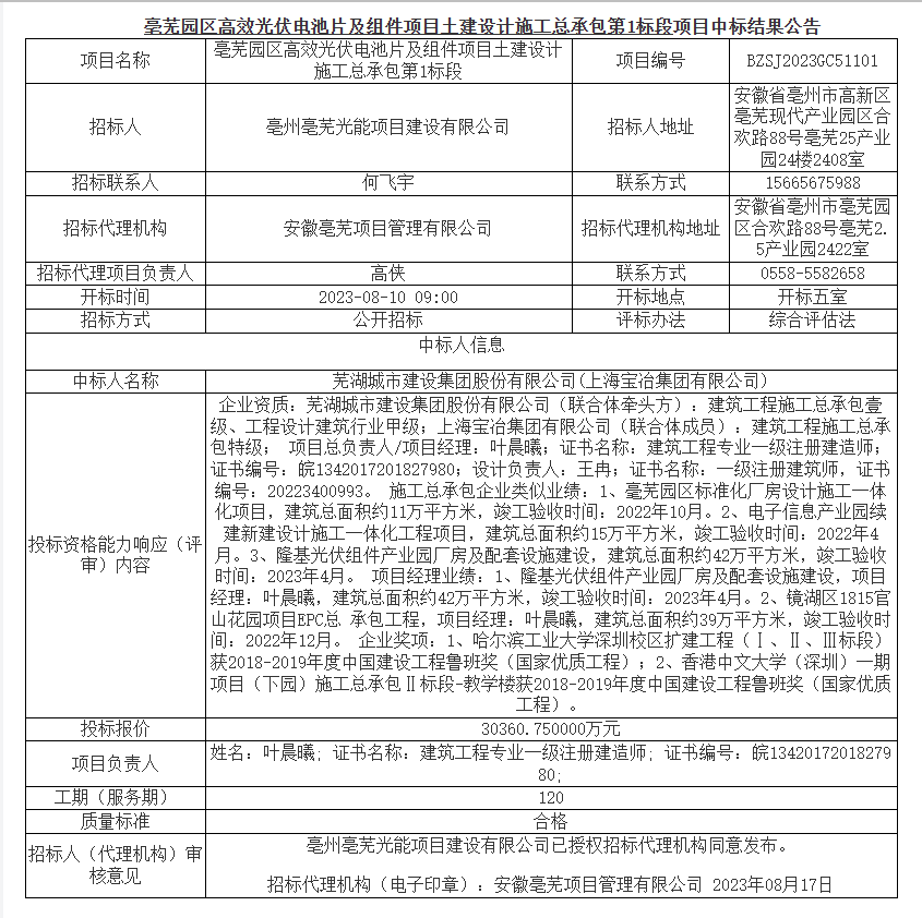 近日,蕪湖城市建設集團股份有限公司緊跟國家可再生能源發(fā)展方向,以良好的信譽、雄厚的技術實力,加之優(yōu)秀的投標方案和合理報價,中標亳蕪園區(qū)高效光伏電池片及組件項目土建設計施工總承包工程,中標金額約為3億元!